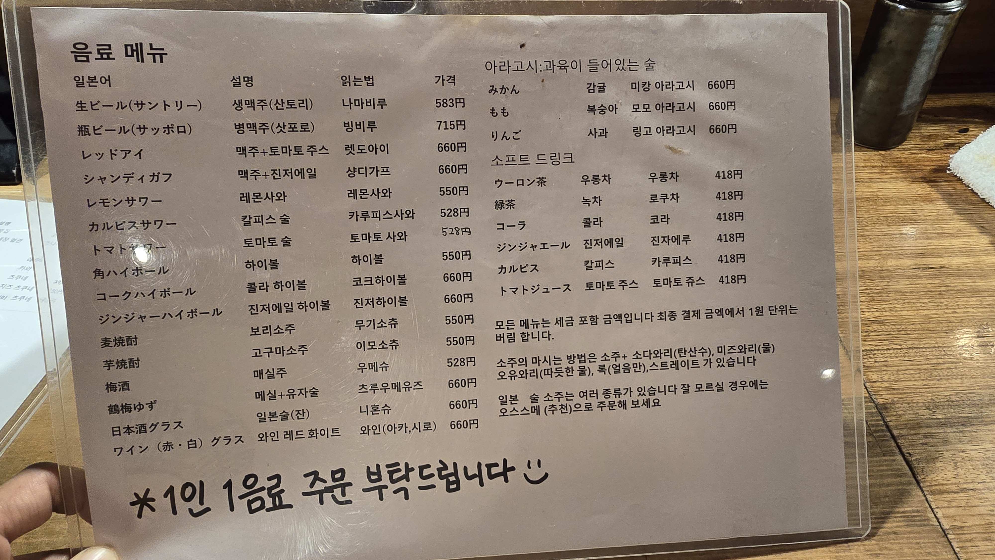 시작은 시원한 산토리 나마비루(생맥주)를, 중간부터는 깔끔한 사케나 하이볼을 곁들이는 것을 추천합니다. 카운터석 위주라 혼자 방문해 '혼술'을 즐기기에도 완벽하며, 메뉴판에 적힌 대로 1인 1음료, 꼬치 2개 이상 주문, 90분 이용 시간 규칙은 꼭 지켜주세요.