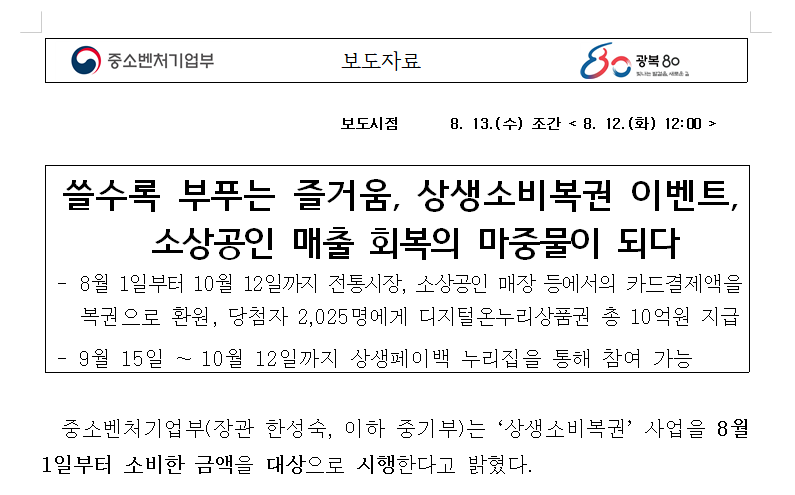 - 어떻게? '상생 페이백'을 신청하면, 소비 기간 내역을 바탕으로 소비 복권에 자동으로 응모 처리됩니다. - 당첨자 발표는 10말
