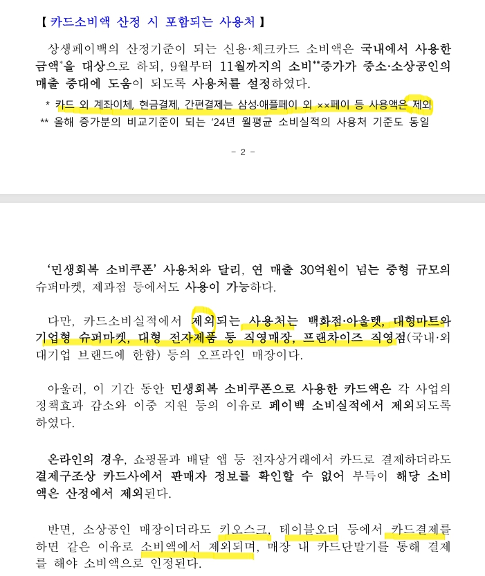 상생페이백의 핵심은 '소상공인 지원'입니다. 따라서 대기업 계열의 매장이나 온라인 쇼핑 등은 소비 실적에서 제외되었습니다.