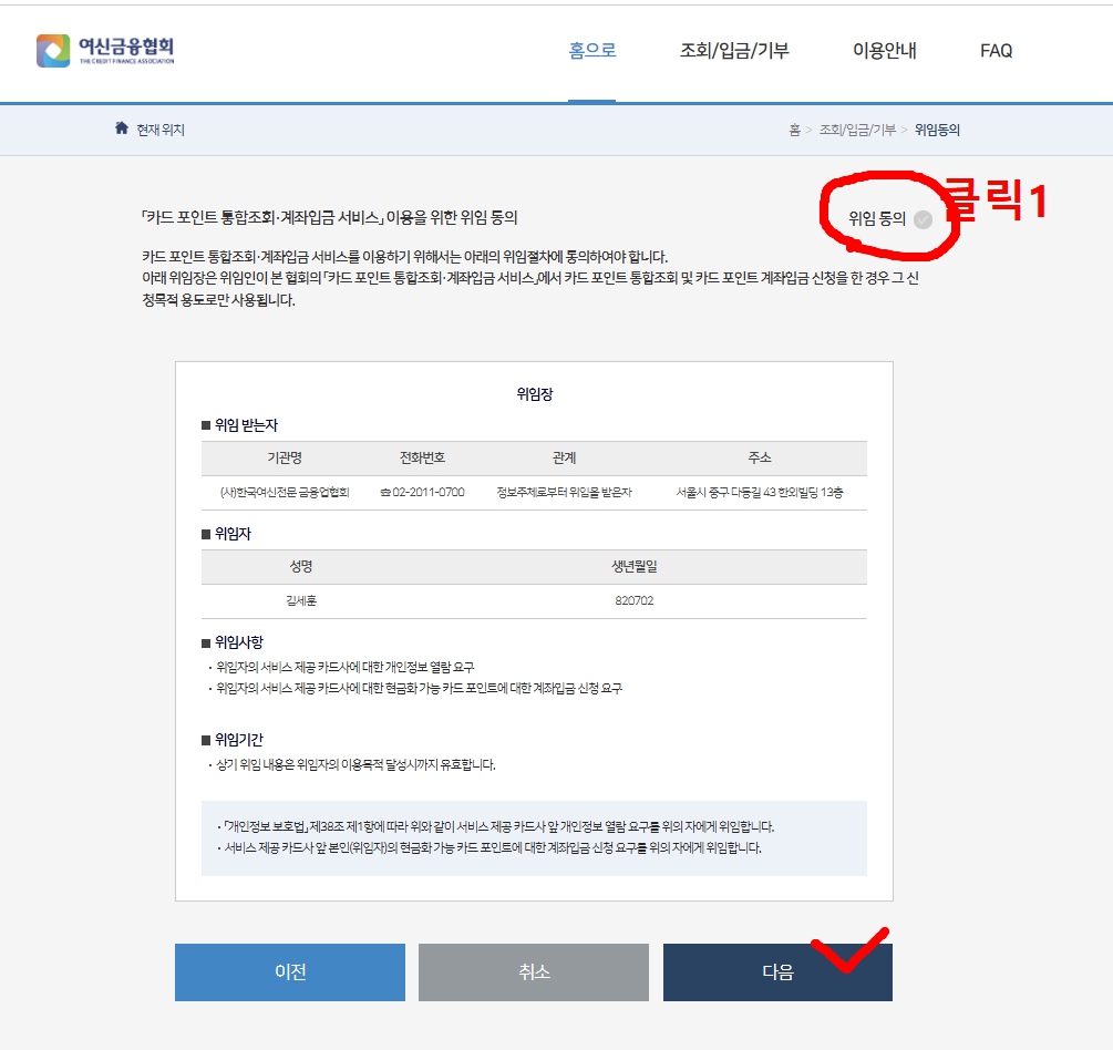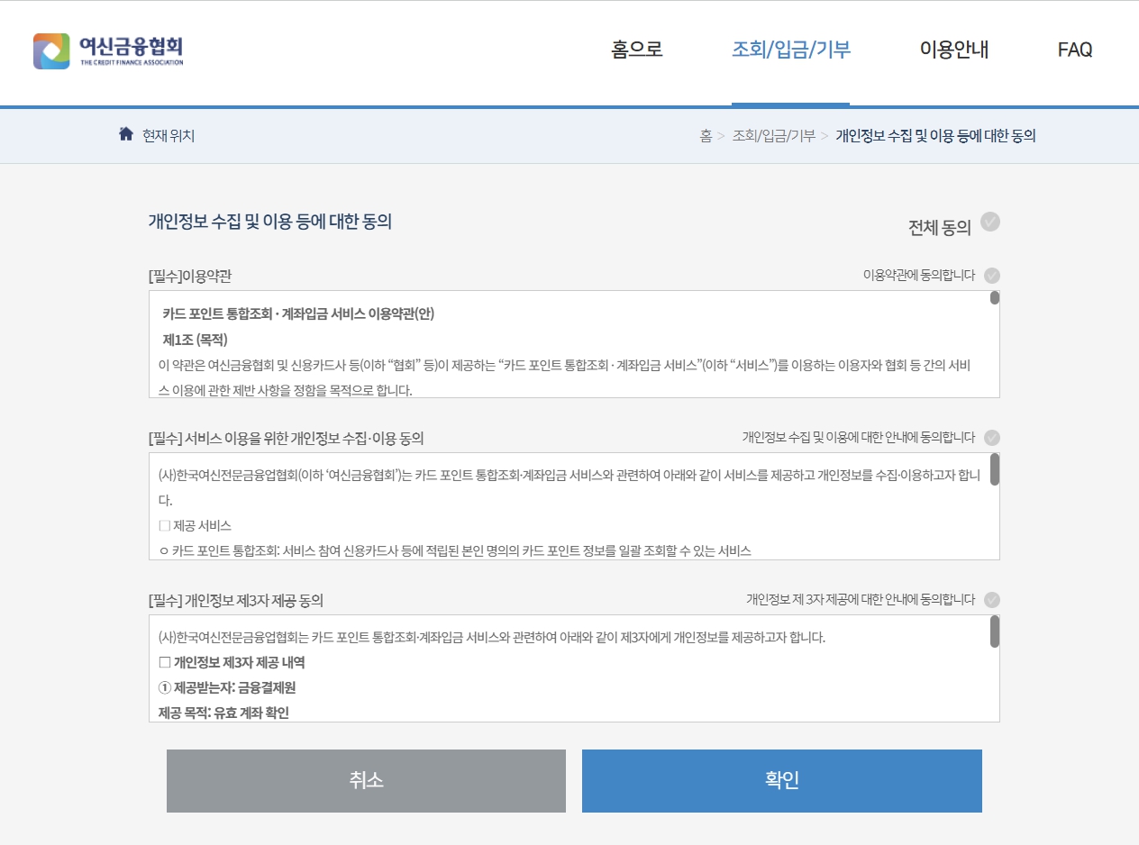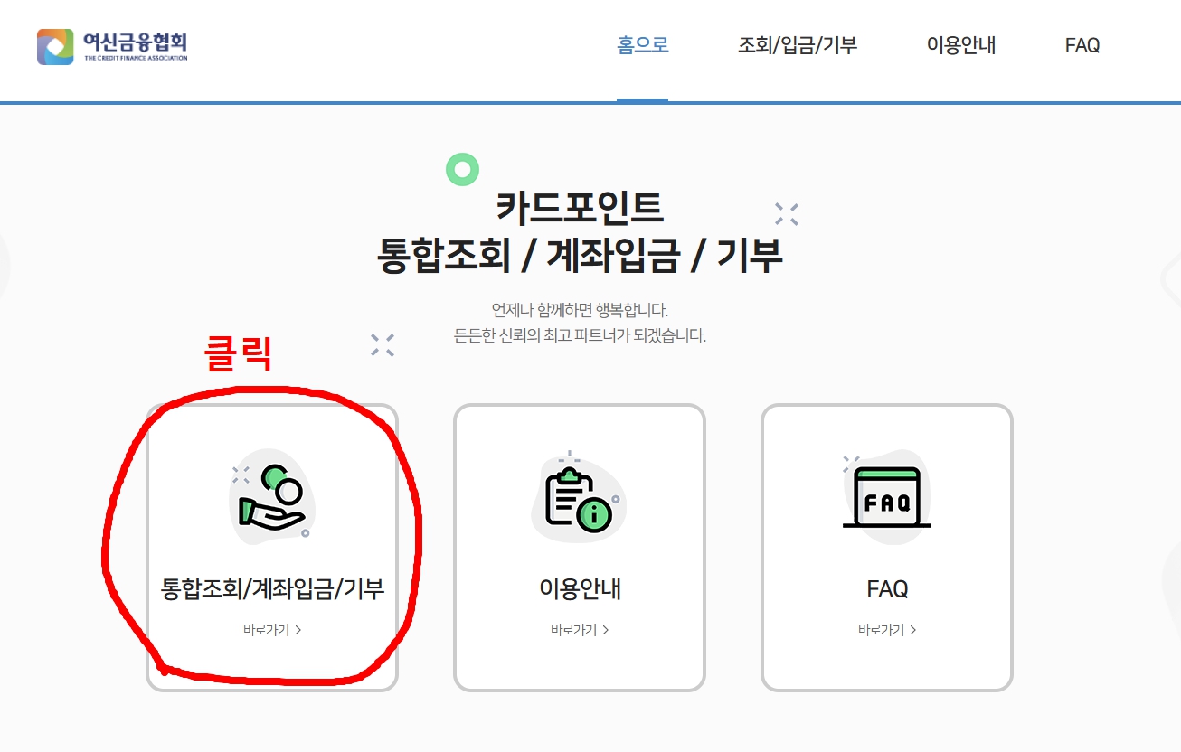 - 여신금융협회 사이트 접속: 포털에서 '카드포인트 통합조회'를 검색하거나 위 버튼을 눌러 사이트에 접속한 후, '통합조회 & 계좌입금/기부'를 클릭합니다. 회원가입 없이 '비회원 조회'를 이용하는 것이 훨씬 간편합니다.