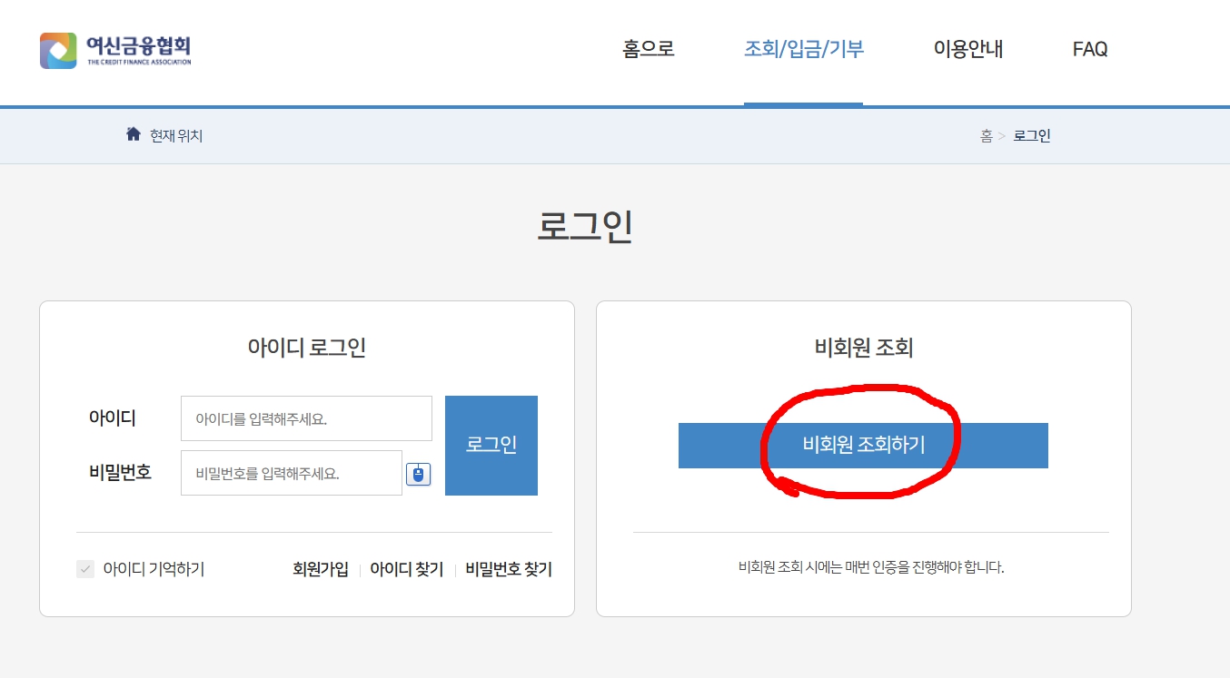 핵심 절차: 비회원 조회 → 본인인증 → '계좌입금' 선택 → 계좌 인증