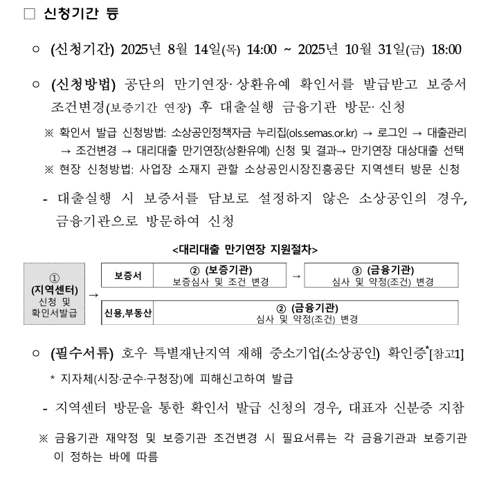 - 현재 소상공인정책자금(대리대출)의 원금을 상환 중이거나, 2025년 12월까지 원금 상환이 시작될 예정인 사업자