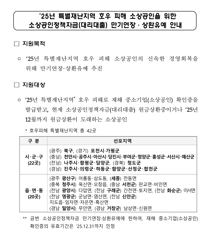 2025년 호우 피해 특별재난지역 소상공인 주목! 정책자금 대출 원금 상환을 12개월 유예해 드립니다. 지원 대상 지역과 신청 자격, 온라인 신청 방법까지 완벽하게 정리했습니다.