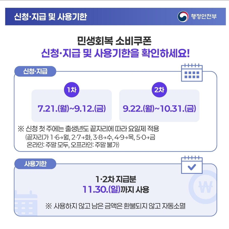 지급받은 소비쿠폰은 11월 30일까지 모두 사용해야 하며, 기한 내에 사용하지 않은 잔액은 자동으로 국가로 환수되니 잊지 말고 꼭 기간 내에 사용하세요!